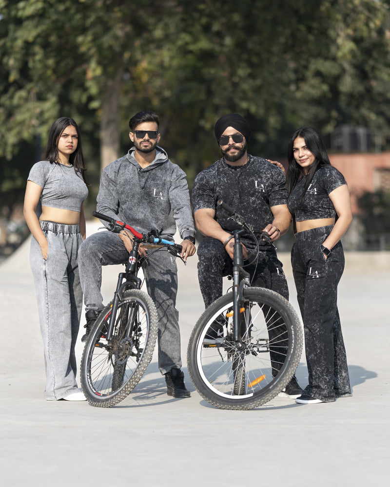 The set typically includes a comfortable and well-fitted top for both partners, whether it's a stylish acid wash t-shirt or a crop top option. The bottoms complement the tops with a coordinating acid wash pattern, ranging from relaxed acid wash pants to sleek acid. The result is a harmonious and visually appealing look that showcases a unified style for the couple.