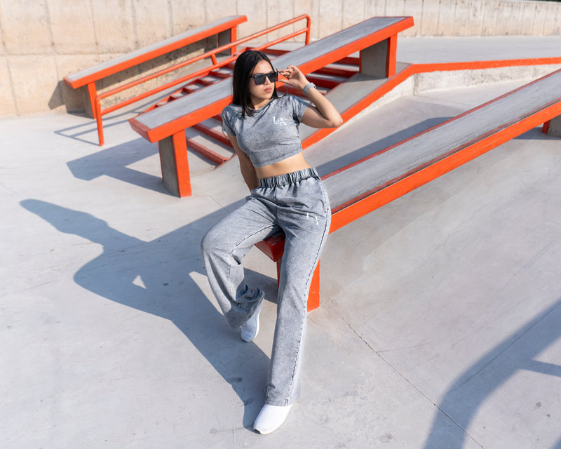 The acid wash technique creates a marbled effect on the fabric, giving each piece in the set a distinctive and one-of-a-kind appearance. The combination of light and dark tones in the acid wash adds depth and dimension to the outfit, making it stand out in any crowd.